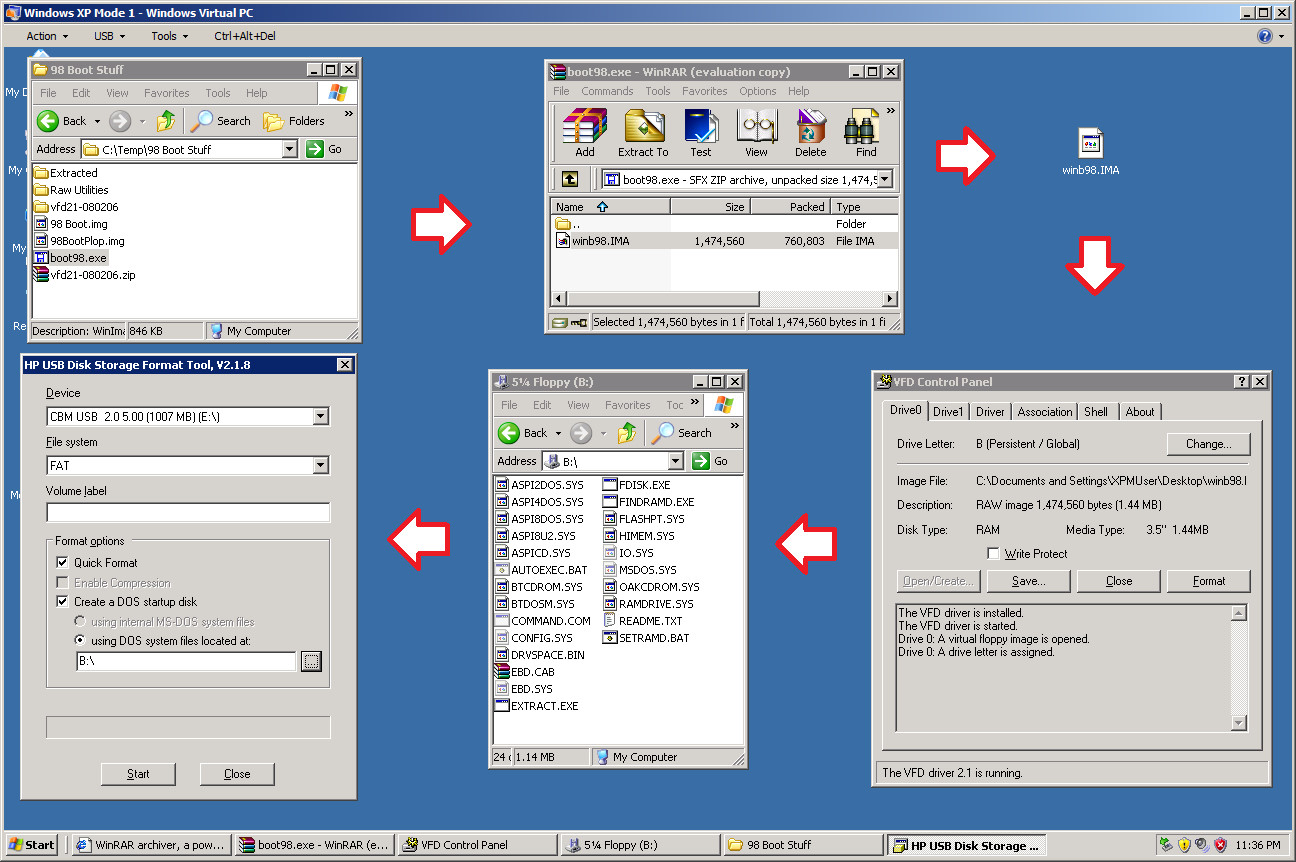 If you have an OS after XP (likely), you will need to do any rendition of this in XP Mode. After you extract the IMA, open the VFD tool, install the driver, start it, do “Open/Create” on Drive0, select your IMA, and set the drive letter to B: (or A: if it is available). When you run the HP Drive Key tool to format your USB key, tell it B: as the location for system files, then copy the files it didn’t retrieve from B: to your USB drive.