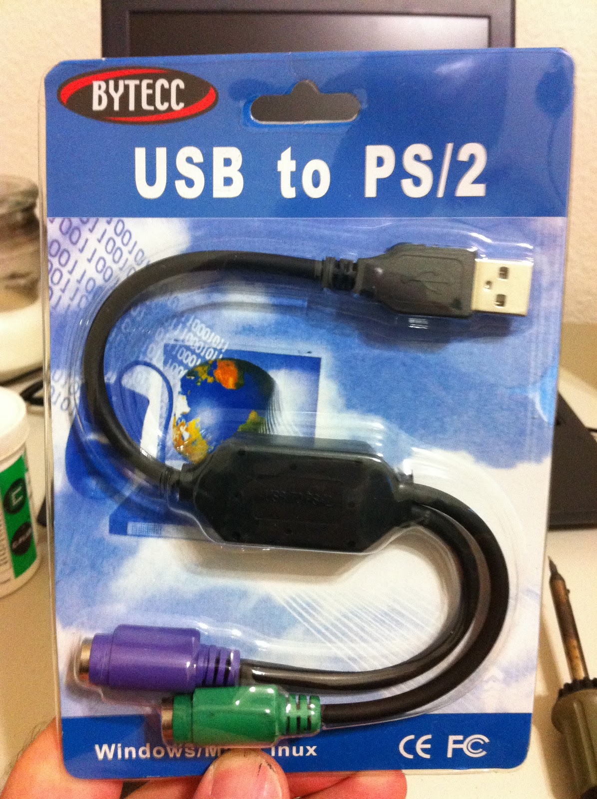 Now to conver to USB – it is easy to use a USB mouse on a PS/2 port and the adapters are fairly standardized, but to go the other direction and use a PS/2 mouse in a USB port requires hardware translation. I think I have read it is only a matter of the clock having to be translated, but either way it needs to be converted. Some keyboards and mice supposedly already contain this clock conversion hardware and it can be used as necessary, so any cheap adapter will work, but in this case I am certain my device was never intended to work over USB. So, I ordered an adapter that was sure to convert the clock. Still a cheapy from MonoPrice, but it does the job.