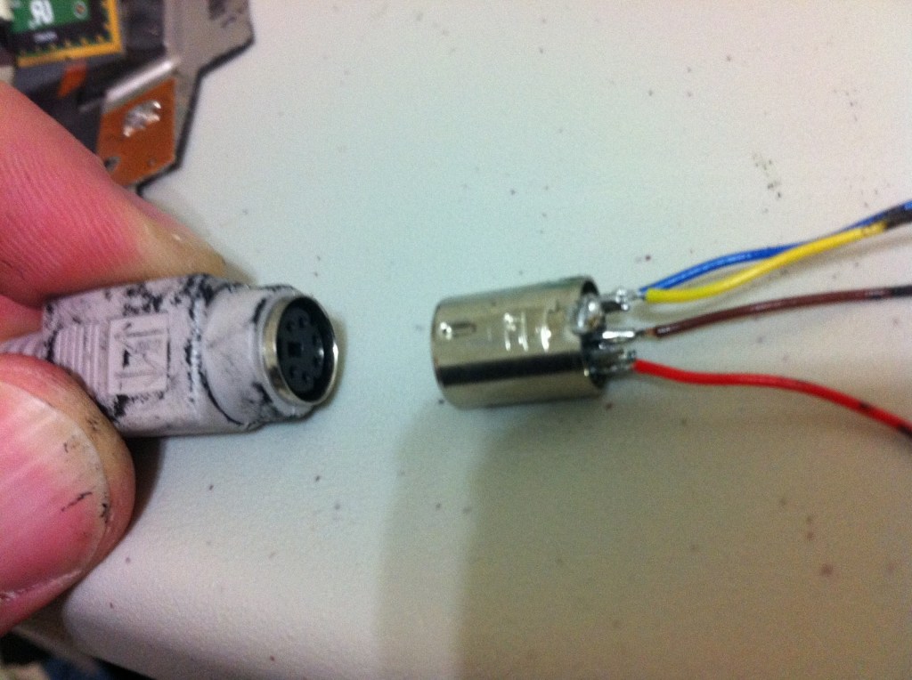 I cut the male end off of an old keyboard, pried out the metal connector, and soldered some wires to the BACK side of it. You can see how the end result will plug into a PS/2 port. It is possible my wire colors are not appropriate, so if you are doing this I would not use them as a reference.