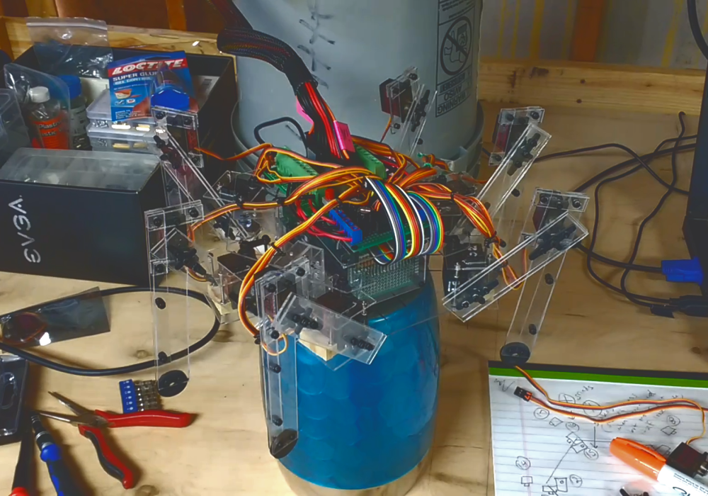 Still working on this guy… sorry no video at this time. He was assembled enough to execute some motion presets that I added to the code, but there are some interference issues and possibly one or two servos that don’t work quite right. I took him back apart to work on shielding but got pulled off the project for a while. So close to getting back to the code.