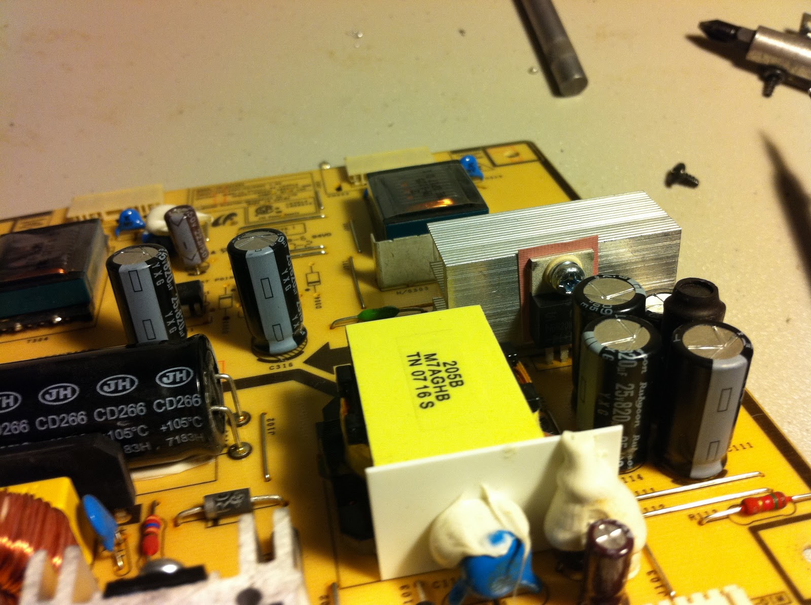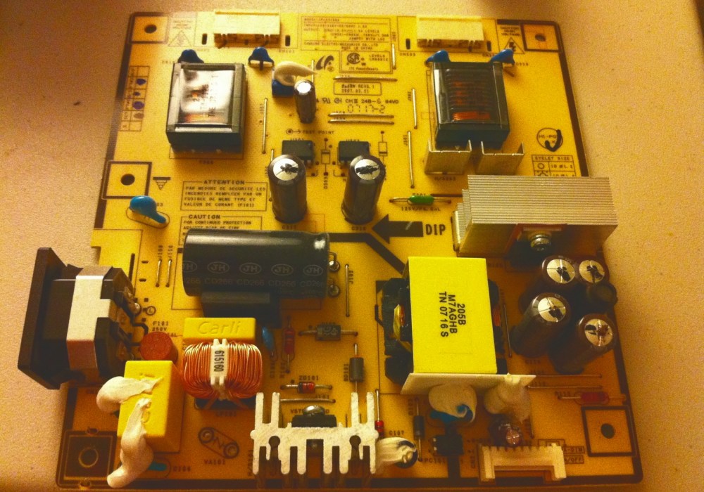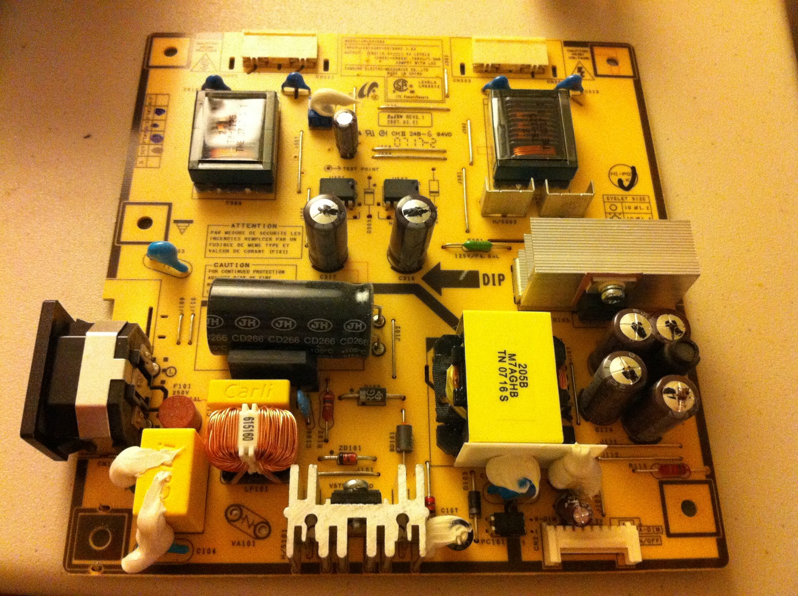 I finally got tired of my main PC monitor flickering and turning off on me. I decided to open it up and see what the problem was. I suspected bad capacitors, because that is a cause for the symptoms it was experiencing. The screen would “flicker” when first turned on, until it would reach a point that the back light would shut off, but the power would remain on (I could tell because the power light would remain on). Turning the screen off, and back on AGAIN would make it show for a few seconds and shut off once again. This would go on for about five minutes, after which the screen and back light would both become available and turn on correctly. So, I pulled the inverter board to take a look.