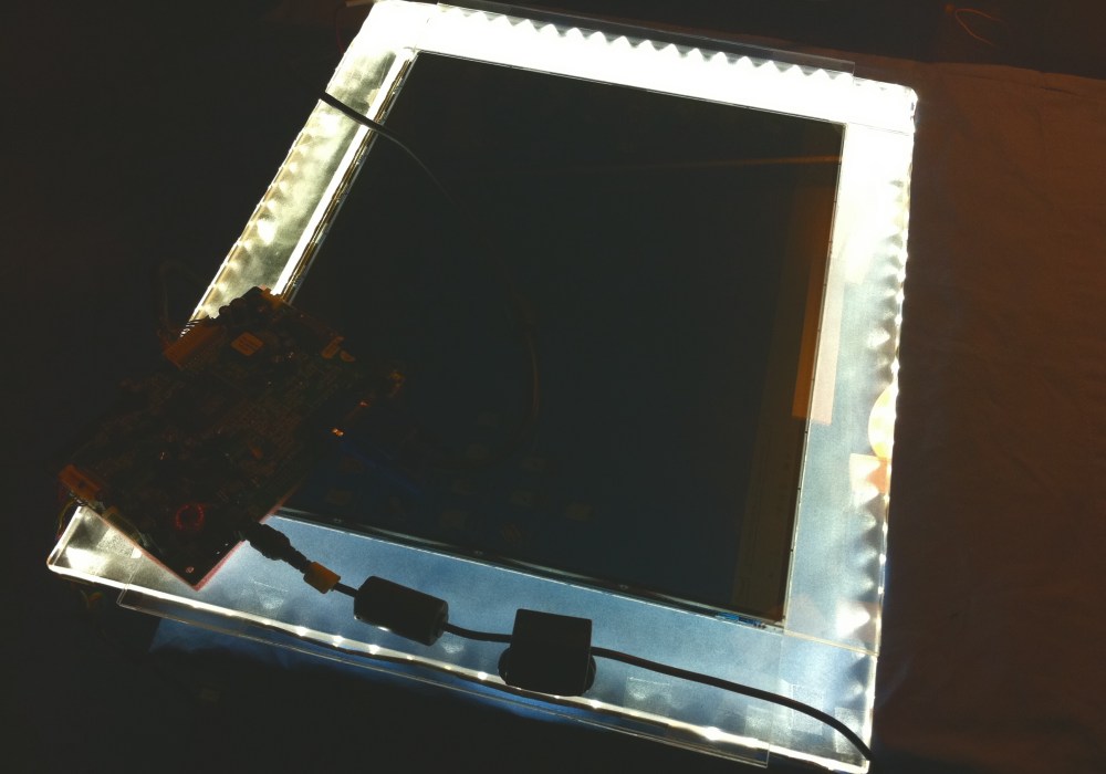 I have completed quite a few changes to the touch table lately. There was a height problem with the lasers – I’m not sure it is completely fixed but it does seem a lot better. I had to add a layer of thin plexiglass below the screen layer, but not the lasers, in order to effectively lower them.