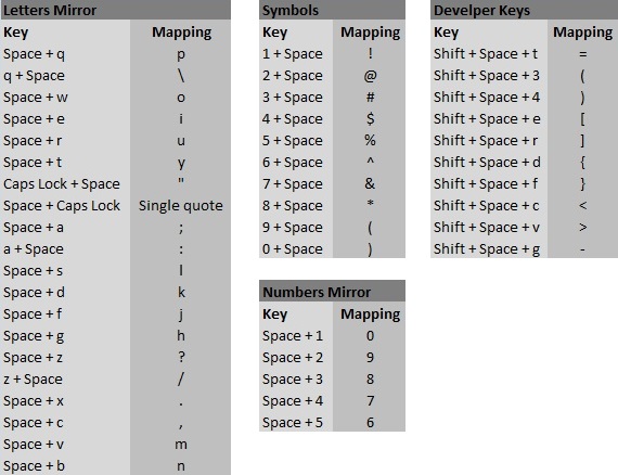 Finally getting around to posting this… a while ago I started work on a “half QWERTY” keyboard or “mirrored” keyboard script. The script makes the left half of the keyboard equal the right half of the keyboard when the space bar is held down (instead of just pressed). The idea eventually evolved and I added a few more functions for convenience such as WASD arrow keys, WASD mouse control (basic), and script on/off control. It’s necessary to be able to turn the script on and off because as a consequence of using the space bar as the modifier for all the keys, there is small delay on some characters that causes problems when typing two-handed. It is surprisingly easier than expected to learn how to type this way, and in fact it is almost normal. A few runs through a typing tutor like Mavis Beacon helps a lot though.